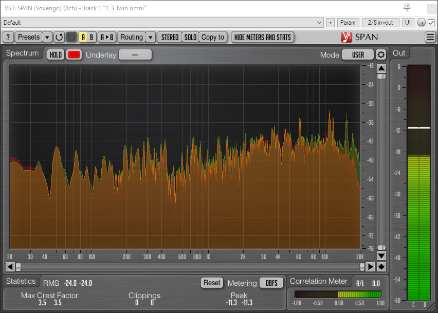 Just as with the pinknoise test in my previous post, this field recording reveals the fall off in high frequencies at 90 degrees to the omni mic created from the MC59 Twin, which, in this MS use, becomes on-axis for frontal sound sources. You can see this in the spectrum analyzer visualization below, which is a snapshot of the sound as the steam loco passes directly in front of the mics. Whether or not you can hear a significant difference is another matter as the drop in sensitivity to high frequencies really only kicks off in this example around 15kHz.