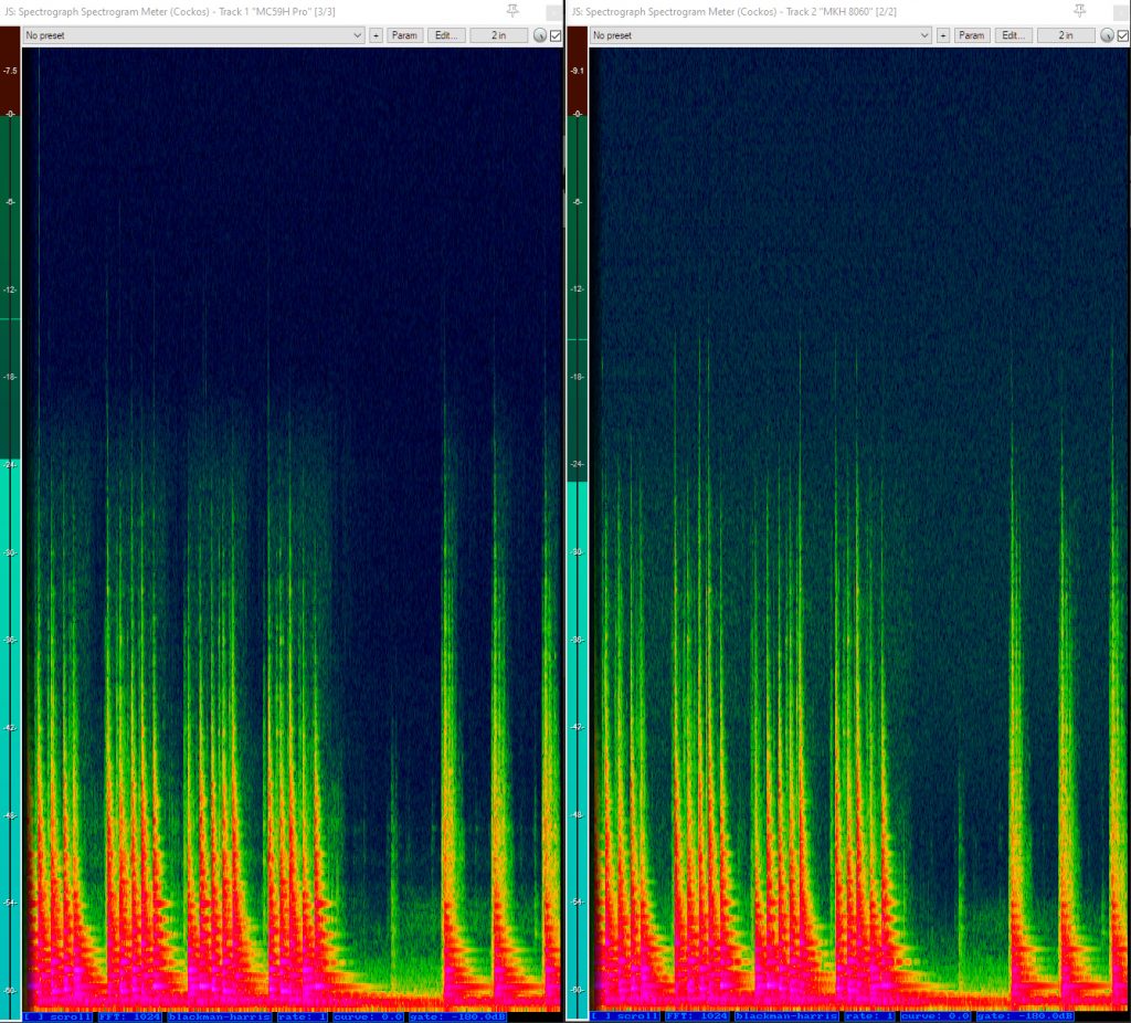 And here is a spectrogram of the recording, showing the chimes. There isn’t a great deal of difference between the two mics in terms of high-frequency response, although the MKH 8060 shows a little more signal above 20kHz, albeit with more self-noise.